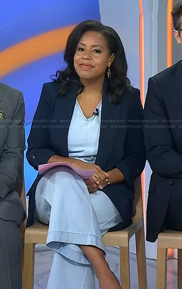 Sheinelle Jones on Today on NBC was spotted wearing this Sheinelle’s denim jumpsuit and navy jacket on Today on Apr 05 2023's episode. Sheinelle's Jumpsuit is the V-Neck Denim Jumpsuit by Universal Thread . Sheinelle's Jacket is the Blazer with Rolled-Up Sleeves in Navy Blue by Zara.