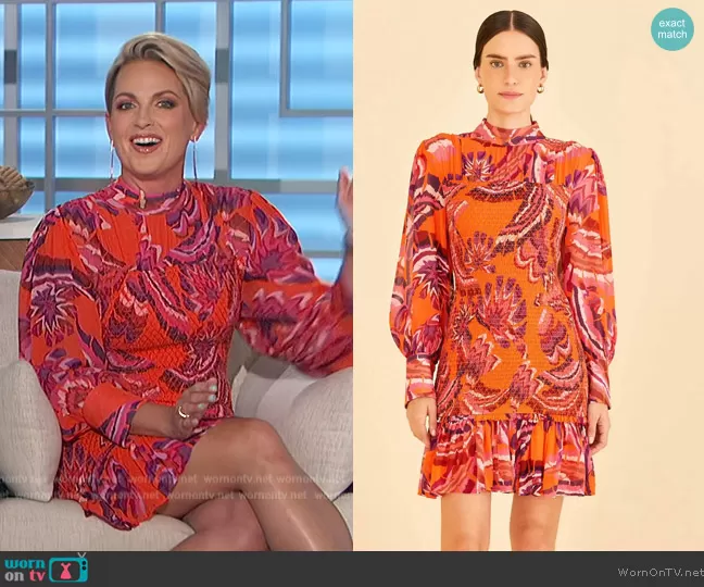 on The Talk on CBS was spotted wearing this red floral smocked mini dress on The Talk on Apr 05 2023's episode. 's Dress is the Orange Chevron Forest Mini Dress by Farm Rio.