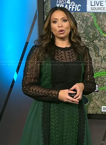Adelle Caballero on Today on NBC was spotted wearing this black and green lace dress on Today on Apr 05 2023's episode. Adelle's Dress is the Lace Mini Dress by Self Portrait.