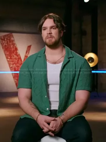 on The Voice on NBC was spotted wearing this green crochet shirt on The Voice on Apr 07 2023's episode. 's Shirt is the Structured Shirt by Zara.