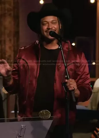 on The Voice on NBC was spotted wearing this red satin shirt on The Voice on Apr 07 2023's episode. 's Shirt is the Western Revere Harrington Jacket in burgundy satin with embroidery by Asos.