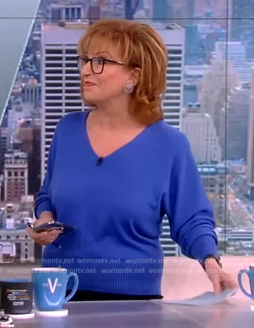 Joy Behar on The View on ABC was spotted wearing this blue v-neck sweater on The View on Apr 05 2023's episode. Joy's Sweater is the Dolman Sleeve Sweater by Lafayette 148.