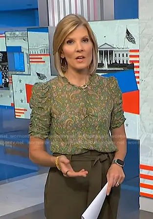 on NBC News Daily on NBC was spotted wearing this green paisley print top on NBC News Daily on Oct 07 2025's episode. 's Top is the Paisley Long Sleeve Silk Blouse by Veronica Beard.
