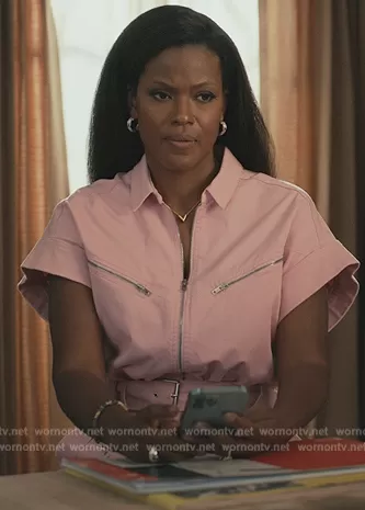 Vivian Banks (played by Cassandra Freeman) on Bel-Air on Peacock was spotted wearing this pink zip pocket jumpsuit on Bel-Air on episode 'Under Pressure' (2x07) in Apr 2023. Viv's Jumpsuit is the Lavine Belted Denim Crop Jumpsuit by IRO.