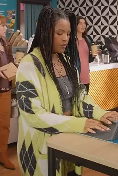 (played by ) on Grand Crew on NBC was spotted wearing this yellow argyle cardigan on Grand Crew on episode 'Wine & Roasts' (2x06) in Apr 2023. 's Sweater is the Fuzzy Argyle Cardigan Sweater by Forever 21.