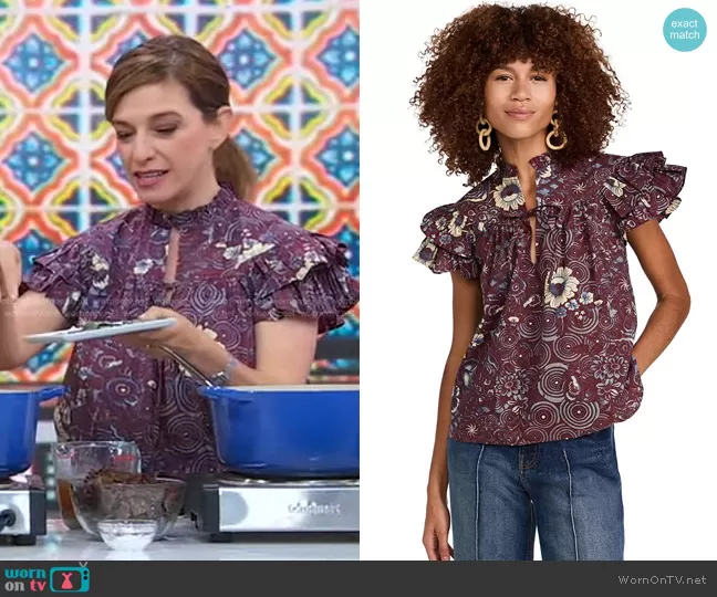 on Good Morning America on ABC was spotted wearing this purple printed ruffle top on Good Morning America on Apr 10 2023's episode. 's Top is the Letty Top in Heliotrope by Ulla Johnson .