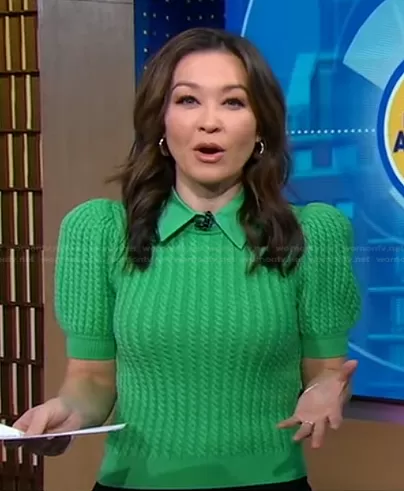 Eva Pilgrim on Good Morning America on ABC was spotted wearing this green cable knit puff sleeve sweater on Good Morning America on Nov 22 2023's episode. Eva's Sweater is the Chase Cable-Knit Puff-Sleeve Sweater by Alice + Olivia.