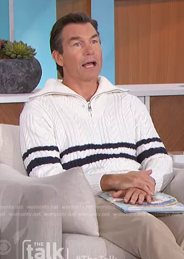 Jerry O'Connell on The Talk on CBS was spotted wearing this white stripe cable knit sweater on The Talk on Feb 27 2024's episode. Jerry's Sweater is the Textured Weave Mock Neck Sweater by Zara.
