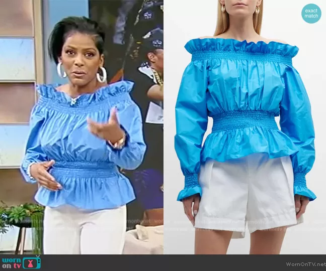 Tamron Hall on Tamron Hall Show on ABC was spotted wearing this blue ruffle off shoulder top on Tamron Hall Show on Apr 10 2023's episode. Tamron's Top is the Smocked Peplum-Waist Off-The-Shoulder Silk Blouse by Adam Lippes.