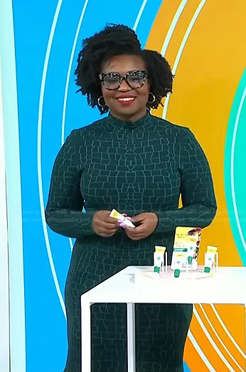 on Today on NBC was spotted wearing this green printed mock neck dress on Today on Apr 10 2023's episode. 's Dress is the Neville Dress by Staud.