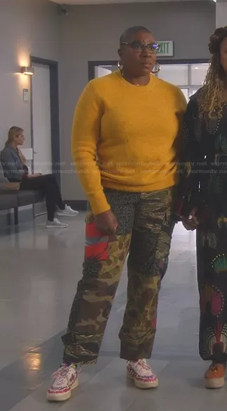 Henrietta Wilson (played by Aisha Hinds) on 9-1-1 on Fox was spotted wearing this yellow sweater and camo pants on 9-1-1 on episode 'Mixed Feelings' (6x13) in Apr 2023. Hen's Sweater is the Soft Knit Mélange Crewneck Sweater by Scotch & Soda . Hen's Pants is the Mix-Print Cargo Trousers by Palm Angels . Hen's Shoes is the Low Tops in Marsala by Veja x Marni.