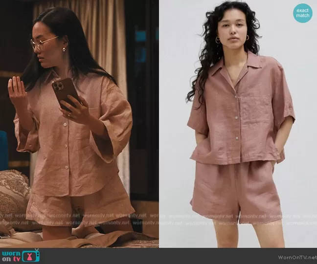 Amy Lau (played by Ali Wong) on Beef on Netflix was spotted wearing this red short sleeve pajama set on Beef on episode 'Just Not All at the Same Time' (1x04) in Apr 2023. Amy's Pajamas is the Stonewashed Linen Pajama Short Set in Smoke Pink by Deiji Studios.