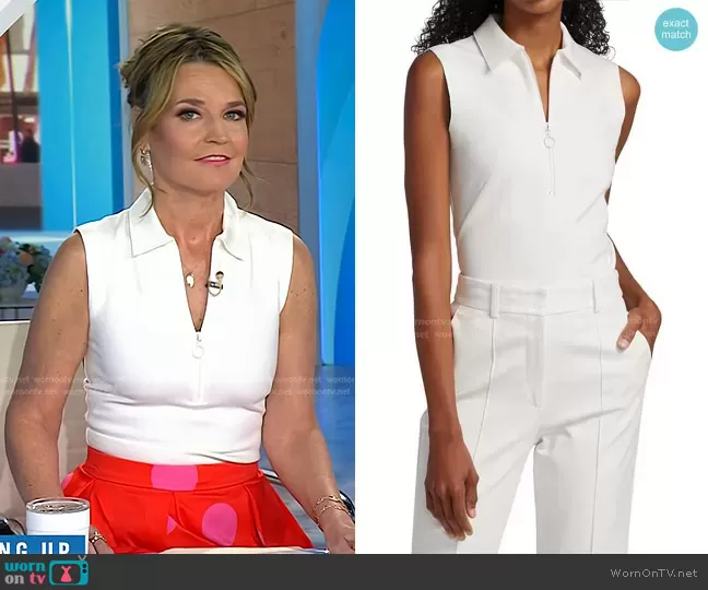 Savannah Guthrie on Today on NBC was spotted wearing this white sleeveless top and red polka dot skirt on Today on Jun 24 2024's episode. Savannah's Top is the Sleeveless Zip Polo Shirt by Akris Punto . Savannah's Skirt is the Giant Dot Faille Skirt by Kate Spade . Savannah's Shoes is the Fae Platform Heel Sandals by Loeffler Randall.
