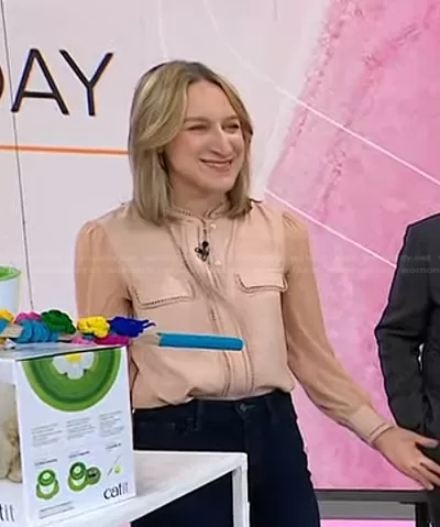 on Today on NBC was spotted wearing this pink ladder-trim blouse on Today on Apr 11 2023's episode. 's Top is the Felicia Ladder-Trim Long-Sleeve Blouse by Reiss.