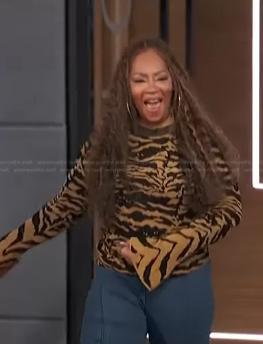 on Access Hollywood on NBC was spotted wearing this beige animal print sweater on Access Hollywood on Apr 11 2023's episode. 's Sweater is the Beverly Knit Jacquard Sweater by Diane von Furstenberg.