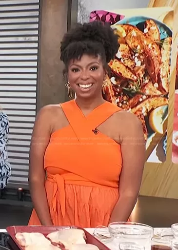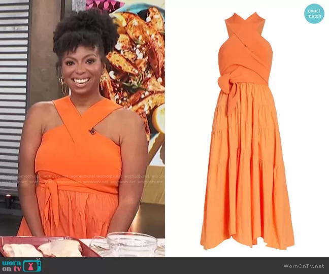 on Access Hollywood on NBC was spotted wearing this orange halter dress on Access Hollywood on Apr 11 2023's episode. 's Dress is the Alivia Mix Media Racerback Dress by Derek Lam 10 Crosby.