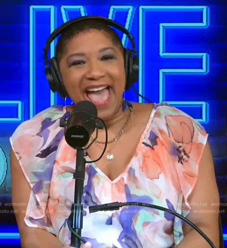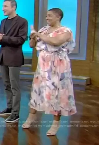 Deja Vu on Live with Kelly and Mark on Disney ABC Home Entertainment was spotted wearing this floral ruffle dress on Live with Kelly and Ryan on Jan 03 2024's episode. Deja Vu's Dress is the Ruffle Sleeve V-Neck Midi Dress by DKNY.