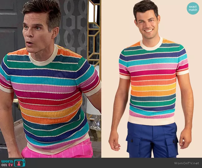 Leo Stark (played by Greg Rikaart) on Days of our Lives on Peacock was spotted wearing this rainbow striped tee on Days of our Lives on Apr 12 2023's episode. Leo's Sweater is the Carlos Short Sleeve Pullover by Mr Turk.