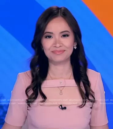 on Good Morning America on ABC was spotted wearing this pink cutout dress on Good Morning America on Apr 02 2024's episode. 's Dress is the Cutout Scuba Crepe Sheath Dress by Tommy Hilfiger.