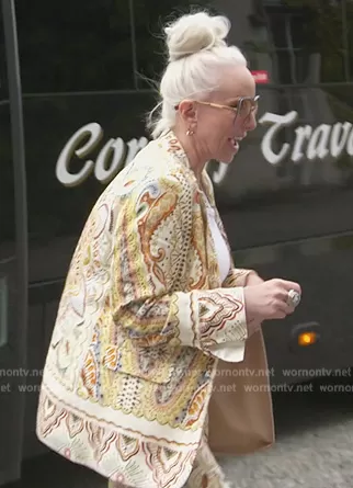 Margaret Josephs on The Real Housewives of New Jersey on Bravo was spotted wearing this printed blazer and pants on The Real Housewives of New Jersey on episode 'The Italian Invasion' (13x10) in Apr 2023. Margaret's Blazer is the Ecru Printed Blazer by Zara . Margaret's Pants is the Printed Linen Trousers by Zara.