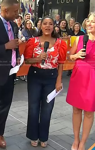 Sheinelle Jones on Today on NBC was spotted wearing this red floral puff sleeve top on Today on May 09 2023's episode. Sheinelle's Top is the Woven Puff-Sleeve Top by Maeve