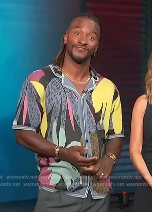 Scott Evans on Access Hollywood on NBC was spotted wearing this abstract floral shirt on Access Hollywood on Apr 12 2023's episode. Scott's Shirt is the Abstract Knit Button Down Camp Shirt by Scotch and Soda.