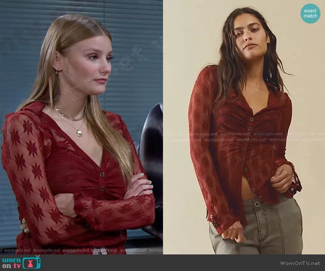 Alice Caroline Horton (played by Lindsay Arnold) on Days of our Lives on Peacock was spotted wearing this red floral sheer top and plaid pants on Days of our Lives on Apr 11 2023's episode. Allie's Top is the Flower Fields Shirtee by Free People . Allie's Pants is the Pleated Plaid Trousers by Maeve.