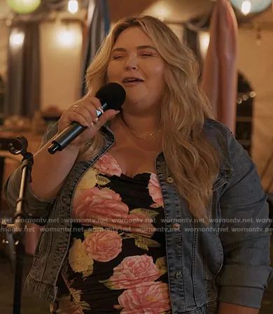 Felicia O'Brien (played by Lily Mae Harrington) on Single Drunk Female on Freeform was spotted wearing this floral ruched mini dress on Single Drunk Female on episode 'Promotion' (2x01) in Apr 2023. Felicia's Dress is the Palmetto Dress in Noir Bouquet by AFRM.