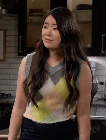 Wendy Shin (played by Victoria Grace) on Days of our Lives on Peacock was spotted wearing this diamond knit vest on Days of our Lives on Apr 14 2023's episode. Wendy's Sweater is the Quinn Sweater Vest in Stormy Spring Combo by Free People.