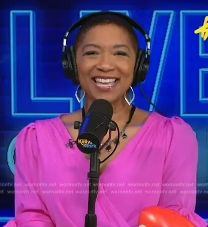Deja Vu on Live with Kelly and Mark on Disney ABC Home Entertainment was spotted wearing this pink tie sleeve wrap dress on Live with Kelly and Ryan on Jun 13 2024's episode. Deja Vu's Dress is the Tie Sleeve Faux Wrap Dress by DKNY.