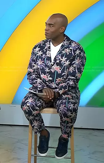 on Today on NBC was spotted wearing this palm tree print suit on Today on Apr 13 2023's episode. 's Jacket is the Printed Single-Breasted Blazer by Scotch & Soda . 's Pants is the The Twilt Printed Pleated Chino by Scotch & Soda.