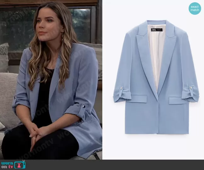 Sasha Gilmore (played by Sofia Mattsson) on General Hospital on ABC was spotted wearing this blue blazer on General Hospital on Apr 13 2023's episode. Sasha's Jacket is the Blazer with Rolled Up Sleeves by Zara .