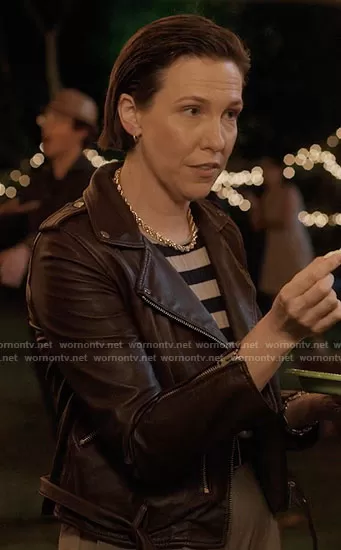 Olivia Elliot (played by Rebecca Henderson) on Single Drunk Female on Freeform was spotted wearing this burgundy leather moto jacket on Single Drunk Female on episode 'Promotion' (2x01) in Apr 2023. Olivia's Jacket is the Balfern Jacket by All Saints.