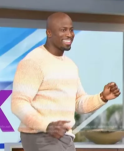 Akbar Gbajabiamila on The Talk on CBS was spotted wearing this orange stripe ribbed sweater on The Talk on Apr 14 2023's episode. Akbar's Sweater is the Gradient cotton-blend sweater by Scotch and Soda.