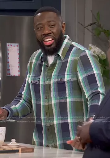 Malcom (played by Sheaun McKinney) on The Neighborhood on CBS was spotted wearing this green and navy plaid shirt on The Neighborhood on episode 'Welcome to the Future' (5x18) in Apr 2023. Malcolm's Shirt is the Blanket Shirt in Jade Hammonds Plaid by Outerknown.
