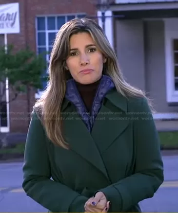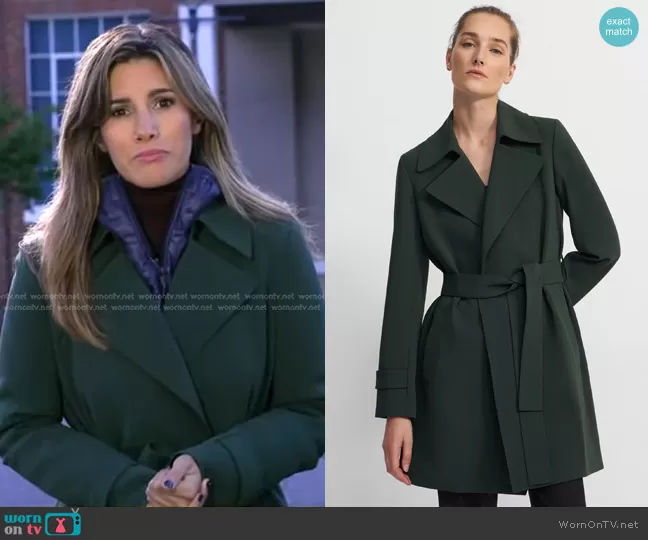 on Good Morning America on ABC was spotted wearing this green wrap coat on Good Morning America on Apr 17 2023's episode. 's Coat is the Short Oaklane Trench Coat in Crepe by Theory.