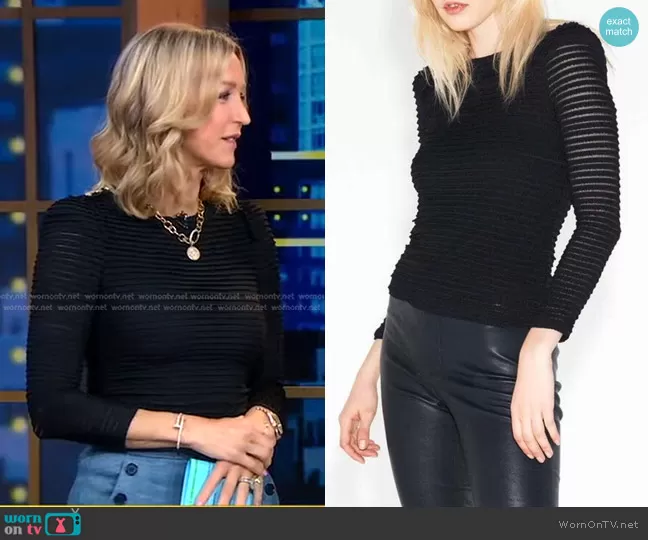 Lara Spencer on Good Morning America on ABC was spotted wearing this black ribbed sweater and blue pants on Good Morning America on Apr 17 2023's episode. Lara's Top is the Nils Ruched Top by Ba&Sh . Lara's Pants is the Tuli Linen Pants by Veronica Beard.