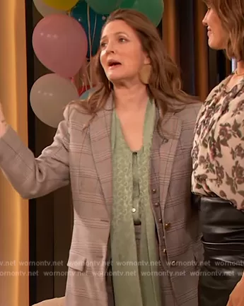 Drew Barrymore on The Drew Barrymore Show on CBS was spotted wearing this gray plaid blazer and tie neck blouse on The Drew Barrymore Show on Apr 17 2023's episode. Drew's Top is the Loose Shirt in Silk Jacquard Mint by Celine . Drew's Vest is the Tailored Vest by Rosetta Getty . Drew's Blazer is the Tailored Jacket by Rosetta Getty . Drew's Pants is the Straight Trouser by Rosetta Getty.