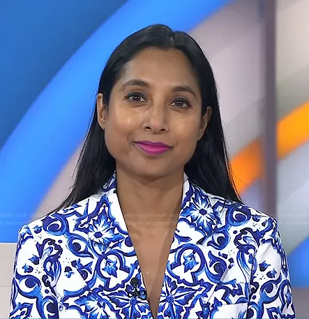 on Today on NBC was spotted wearing this blue and white printed blazer on Today on Apr 17 2023's episode. 's Set is the Blazer & Pant Set by Burryco.