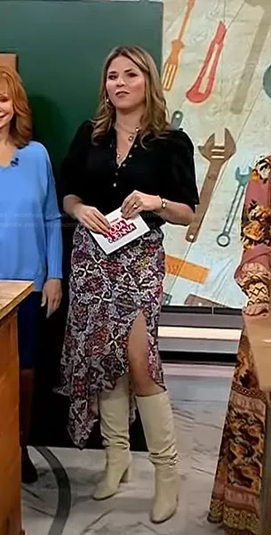 Jenna Bush Hager on Today on NBC was spotted wearing this black top and printed asymmetric skirt on Today on Aug 22 2023's episode. Jenna's Top is the Coralee Puff-Sleeve Top by Veronica Beard . Jenna's Skirt is the Mac Mixed Paisley Asymmetric Skirt by Veronica Beard.