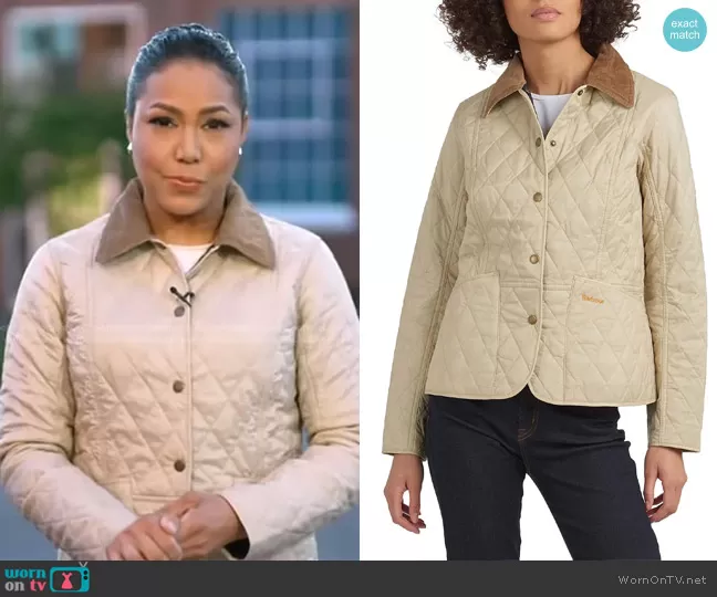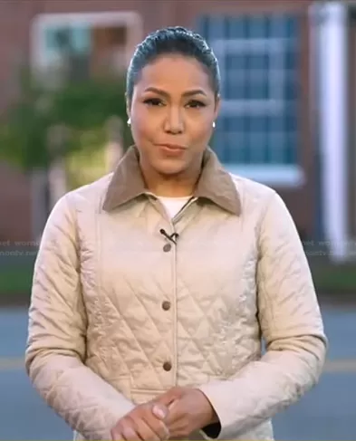 Stephanie Ramos on Good Morning America on ABC was spotted wearing this ivory quilted jacket on Good Morning America on May 01 2024's episode. Stephanie's Jacket is the Summer Liddesdale Quilted Jacket by Barbour.