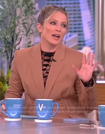 Sara Haines on The View on ABC was spotted wearing this beige lace-up blazer and mesh top on The View on Apr 18 2023's episode. Sara's Top is the Icon Flocked Star Sheer Mesh Turtleneck Top by Mugler . Sara's Blazer is the Maverick Jacket by A.L.C. . Sara's Pants is the Kennedy Pants by A.L.C..