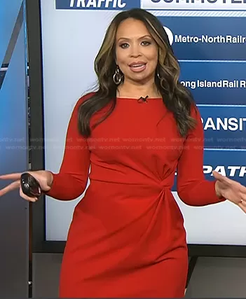 Adelle Caballero on Today on NBC was spotted wearing this red twist detail dress on Today on Apr 18 2023's episode. Adelle's Dress is the Crepe Dress with Twist Detail at Side Waist by Donna Morgan.