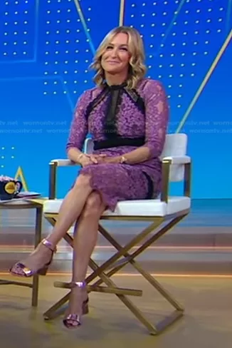 Lara Spencer on Good Morning America on ABC was spotted wearing this purple and black lace dress on Good Morning America on Apr 19 2023's episode. Lara's Dress is the Orchid Marisa Dress by Alexis.