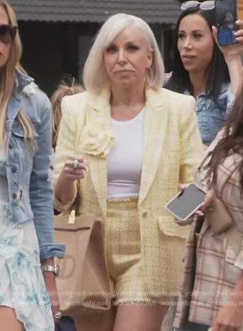 Margaret Josephs on The Real Housewives of New Jersey on Bravo was spotted wearing this yellow tweed blazer and shorts on The Real Housewives of New Jersey on episode 'I Smell a Rat' (13x11) in Apr 2023. Margaret's Blazer is the Pricilla Tweed Blazer by Cinq a Sept . Margaret's Shorts is the Coronado Tweed Shorts by Cinq a Sept.