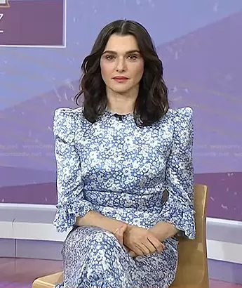 on Today on NBC was spotted wearing this blue floral dress on Today on Apr 19 2023's episode. 's Dress is the The Falconetti Ruffled Floral-Print Silk Dress by The Vampire's Wife.