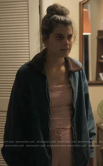 Samantha Fink (played by Sofia Black-D'Elia) on Single Drunk Female on Freeform was spotted wearing this pink textured top and oversized denim jacket on Single Drunk Female on episode '4th Step' (2x04) in Apr 2023. Sam's Top is the Love Letter Cami in Flower Trail by Free People . Sam's Shoes is the Samba Sneakers by Adidas.