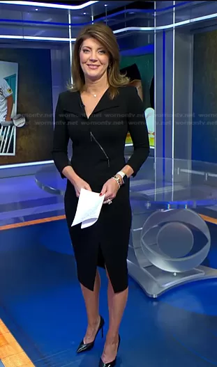 Norah O'Donnell on CBS Evening News on CBS was spotted wearing this black zip front sheath dress on CBS Evening News on Apr 19 2023's episode. Norah's Dress is the Zip-Front Jersey Midi Dress by Giorgio Armani.