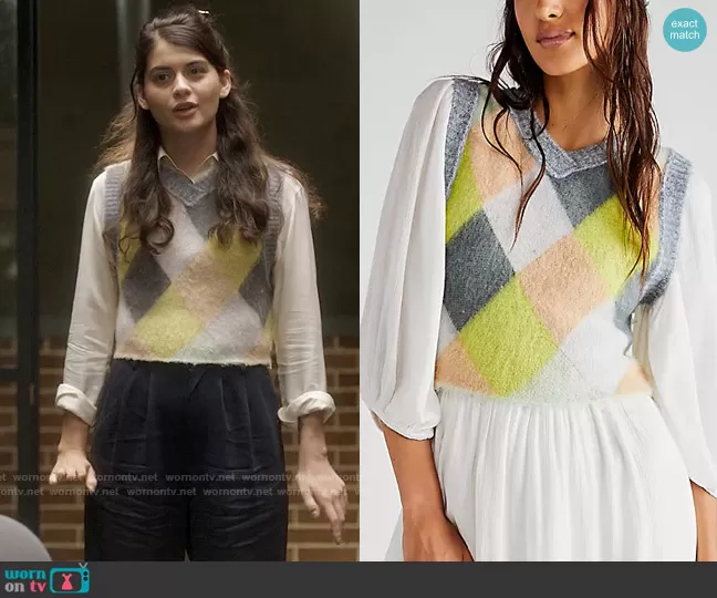 Samantha Fink (played by Sofia Black-D'Elia) on Single Drunk Female on Freeform was spotted wearing this diamond print sweater vest on Single Drunk Female on episode 'Group of Drunks' (2x10) in Apr 2023. Sam's Vest is the Quinn Sweater Vest in Stormy Spring Combo by Free People . Sam's Pants is the Mason Pants by Reformation.