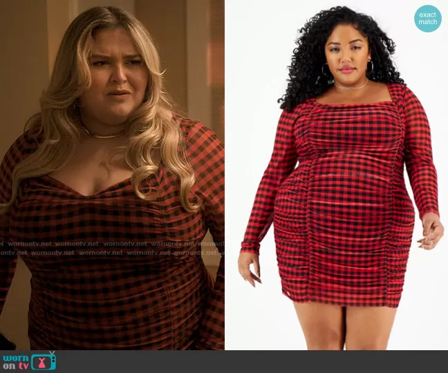 Felicia O'Brien (played by Lily Mae Harrington) on Single Drunk Female on Freeform was spotted wearing this red checked dress on Single Drunk Female on episode 'Group of Drunks' (2x10) in Apr 2023. Felicia's Dress is the Checkered Square-Neck Mesh-Overlay Ruched Mini Dress by Bar III.
